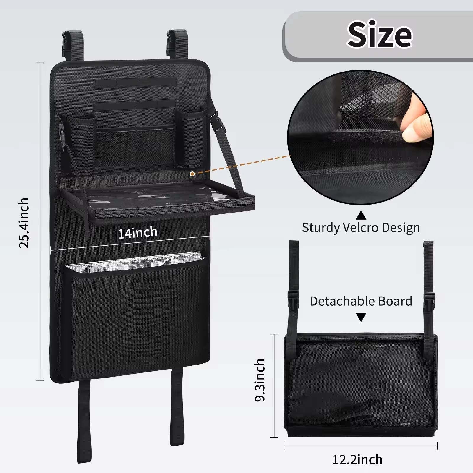 Includes: 1 x large insulated pockets, 2 x mesh pockets, 2 x small pockets, 8 x elastic bands and 1 x detachable board